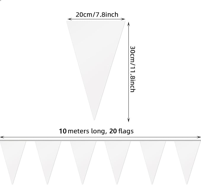 - 【White Pennant Bunting Set】: The total length of the White Triangle banner is 32.8 feet, divided into 1 strips, each 32.8 feet long. 20Flag, Each Pennant Banner 20Flag Size: 7.87''/20cm width x 11.8''/30cm height for birthday Themed Party Decoration many occasions, and so on