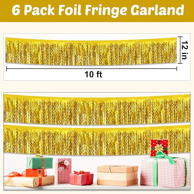 6 Pack 10 Feet Gold Wave Foil Fringe Garland Metallic Tinsel Streamers Banner Wall Hanging Curtain Backdrop for Parade Floats, Mother's Day, Easter, Wedding, Birthday Party Decoration