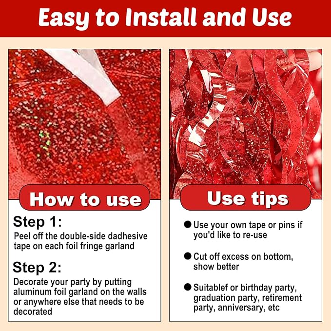 - Applicable Occasion: This shiny tinsel Foil Fringes garlands is also Perfect for parade floats, as shiny tassel banner, use to run along the top of a backdrop or anywhere you want to add shimmer. Suitable for Patriotic display, homecoming float, birthday party, theme party, Halloween, Christmas, New Year's Eve, bachelorette party, Gender Reveal Party, Anniversary, Hollywood Party, wedding, easter party, disco party decorations, carnival party, bridal shower, baby showers, graduations and more.