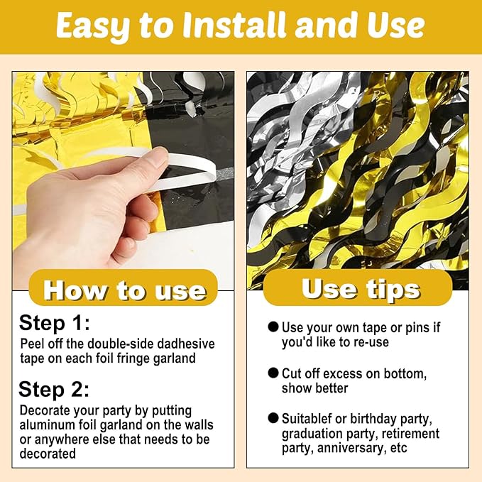 - Various Colors: Pair and match with different color fringe garland to achieve your desired color combination. Show off your creativity by pairing this Gold Foil Fringe party banner with other Fringe wall banner of different colors to achieve the color combination that you desired. Together with some balloons, led-lights, banners, pom-poms, swirls and Foil Fringe Curtain Backdrop you will be surprised and proud of the atmosphere and view you create.