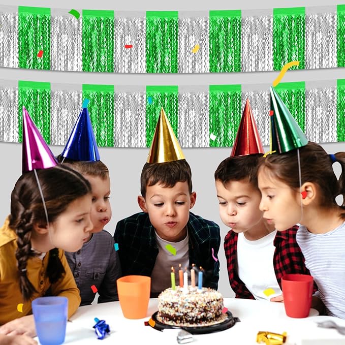 6 Pack 10 Feet Silver Green Wave Foil Fringe Garland Metallic Tinsel Streamers Banner Wall Hanging Curtain Backdrop for Parade Floats, Mother's Day, Easter, Wedding, Birthday Party Decoration