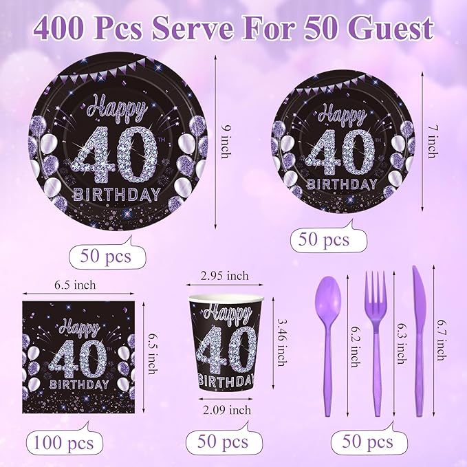 - Eye Catching Design: our happy 40th birthday tableware adopt an appealing purple black design, which is not only pleasing to the eyes but also adds aesthetic value to your party's theme; The colors are vibrant and rich, which creates a more enjoyable dining experience for your guests