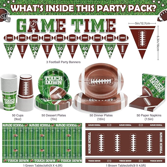 - Ultimate Football Party Supplies Set: Ecomore 205PCS football party decoration and Disposable Dinnerware Set has everything you need to host an exciting & hassle-free party for up to 50 guests! The Football Party Supplies Set Football-themed Birthday Football Game Day Party Decor includes: 50 x 12" Football Plates, 50 x 7" Dessert Plates, 50 x 9Oz Football Cups, 50 Football Napkins, 2 Football Tablecloths (9X4.5ft), 3 Football Flag Banners: Each banner contains 10 flag panels (5"x6.3" per panel)