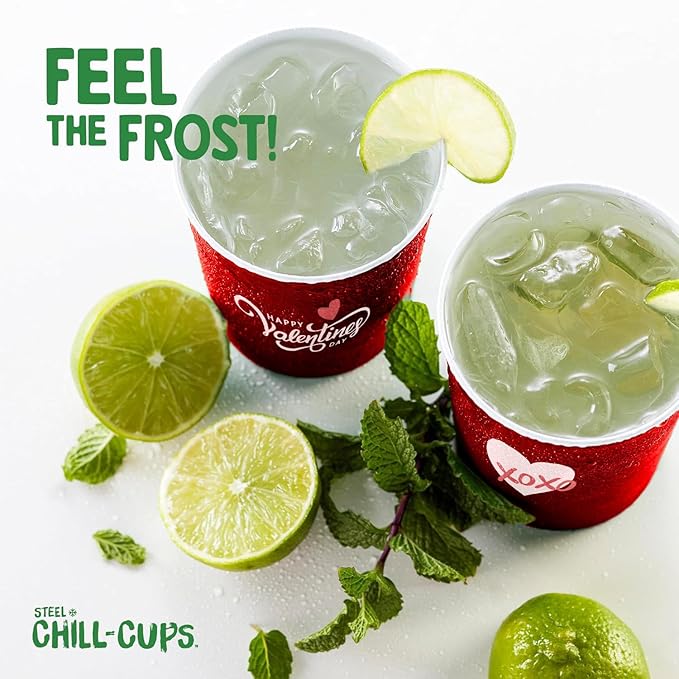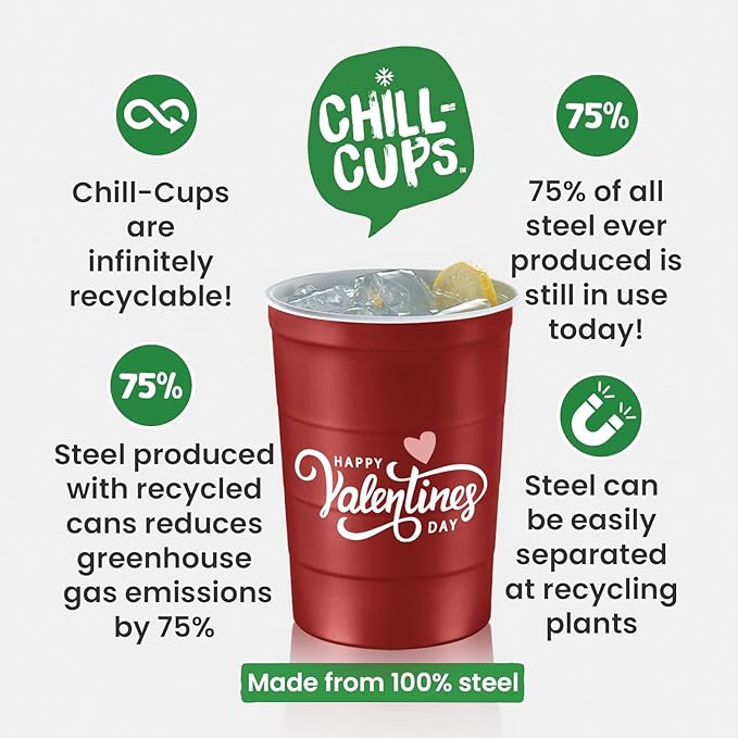 - Earth-Friendly Drinkware: Unlike plastic party cups that end up in landfills, sustainable Valentine's Day Steel Chill Cups are 100% recyclable; reuse hand-washable cups for your corporate event