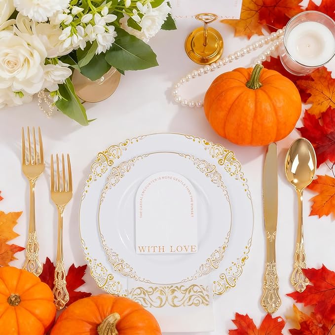 Ciaell 300PCS White and Gold Plastic Plates - Gold Disposable Dinnerware Sets for 50 Guests - 100 Plates, 50 Knives, 50 Forks, 50 Spoons, and 50 Napkins for Wedding, Anniversary, Party & Thanksgiving