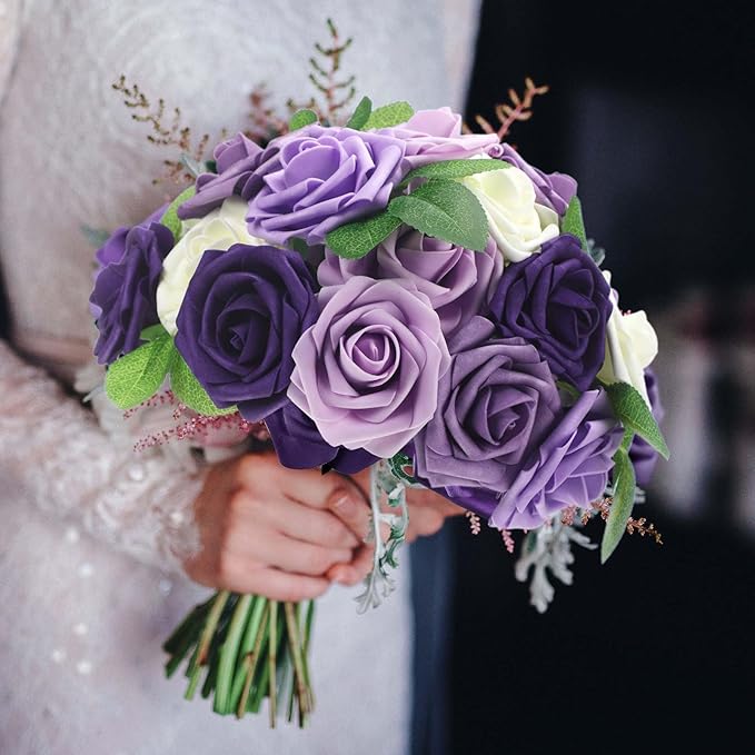 100 Pieces Artificial Foam Rose Flowers Faux Bouquet with Leaves and Stems for DIY Wedding Bouquets Centerpieces Bridal Shower Party Valentine Home Decorations(Shades of Lavender)