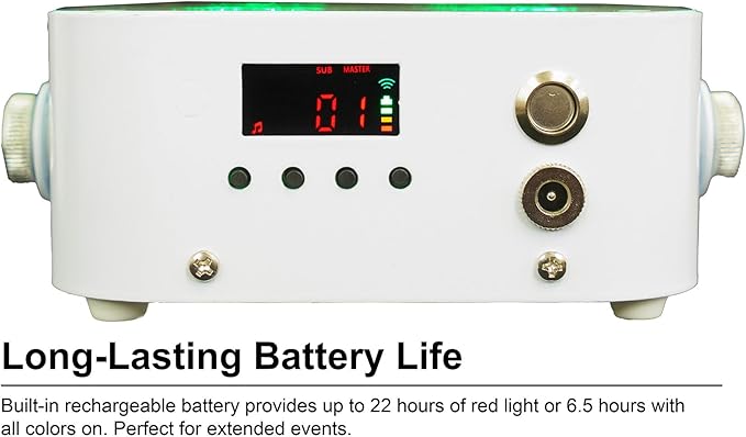- LONG BATTERY LIFE & RGBWA+UV LED: The lights offer a long battery life (up to 22 hours on red), and the RGBWA+UV LED system adds White, Amber, and Ultra Violet to the traditional RGB colors for enhanced color options.