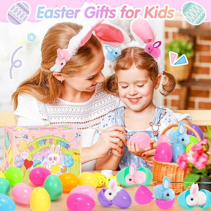 SevenQ Easter Eggs Fillers with Bunny Hair Clips Colorful 24 Pack, Easter Basket Stuffers Party Favors Gift Bags for Kids Cute Stuff Plush Fidget Toys Classroom Treasure Box Egg Hunt Games Supplies