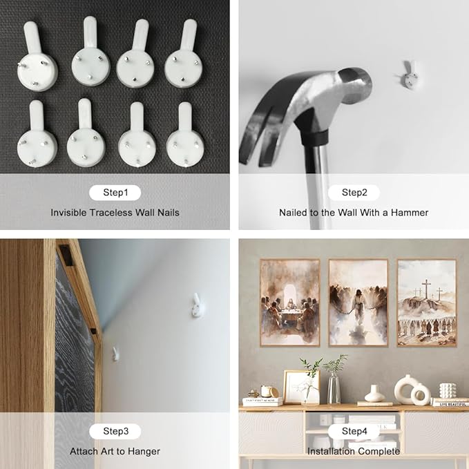- 【Jesus Theme Neutral Wall Art】This group of triptychs uses mainly delicate brushstrokes and soft tones. The first one symbolizes the beginning of faith and sacrifice; the second one signifies the journey of suffering and redemption; and the third one expresses the firmness and admiration for faith. These paintings are a beautiful vehicle for faith and spirituality. Whether they are used as home decorations or embellishments for religious places, they can bring deep thoughts and spiritual comfort to the viewers.