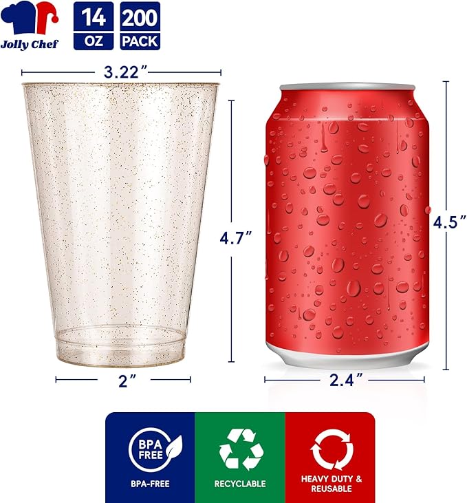 JOLLY CHEF 14 oz 200 Pack Gold Plastic Cups, Gold Glitter Heavy-Duty Disposable Cups Party Cups Tumblers, Ideal for Thanksgiving Wedding & Party