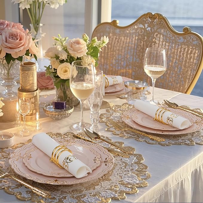 - Elegant Design: The pink plastic plates with gold rim create a striking impression at any event, enhancing the table setting with an air of elegance and refinement.Whether for a wedding, anniversary, or special event, plastic plates disposable exude elegance, complementing any color scheme or decor style and making your table look both upscale and timeless.