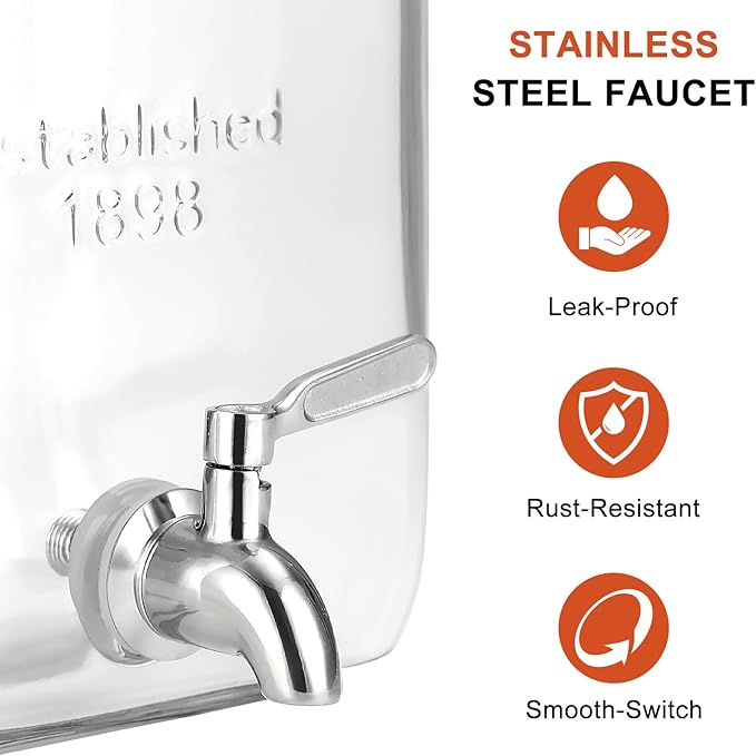 - Premium Quality Materials: Crafted with a thick silicone gasket and a durable stainless steel spout, this glass dispenser is built to last. It is leak-proof, rust-resistant, and corrosion-resistant, ensuring long-lasting quality and reliability.