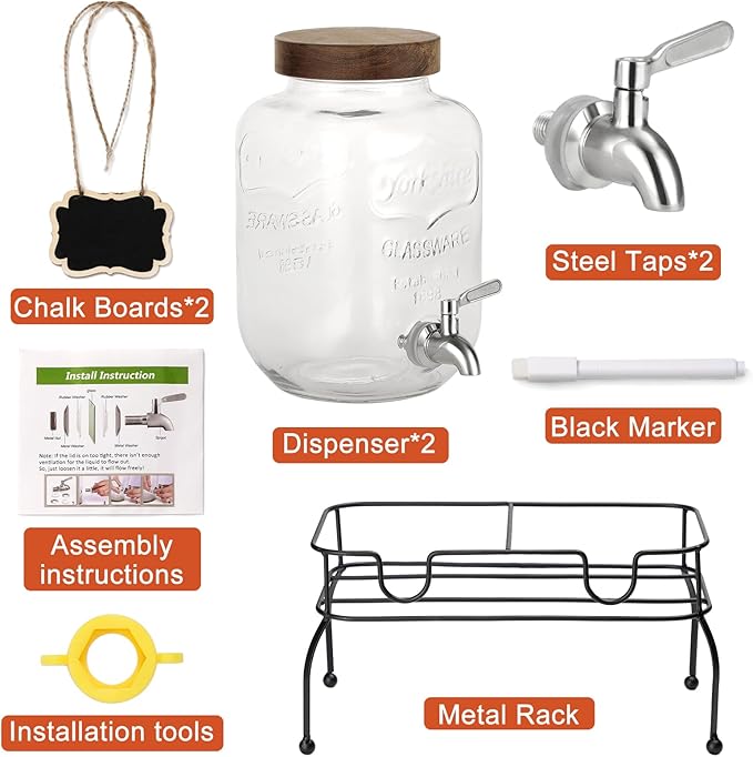 - Drink Dispenser Includes: 2 piece 1 gallon beverage dispenser comes with stand, chalkboard and chalk for labeling. Stainless steel faucet for easy pouring and wooden lid not only looks elegant but also ensures durability and freshness.