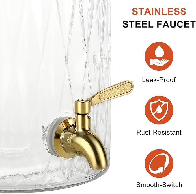 - Durable Materials & Thoughtful Design:Crafted from premium lead-free glass, this beverage dispenser is strong, transparent, and safe for everyday use. The stainless steel spigot ensures a smooth, leak-free pour, while the airtight lid helps preserve the freshness of your drinks. Its compact design fits easily in most refrigerators, making it a great drink dispenser for fridge and countertop use