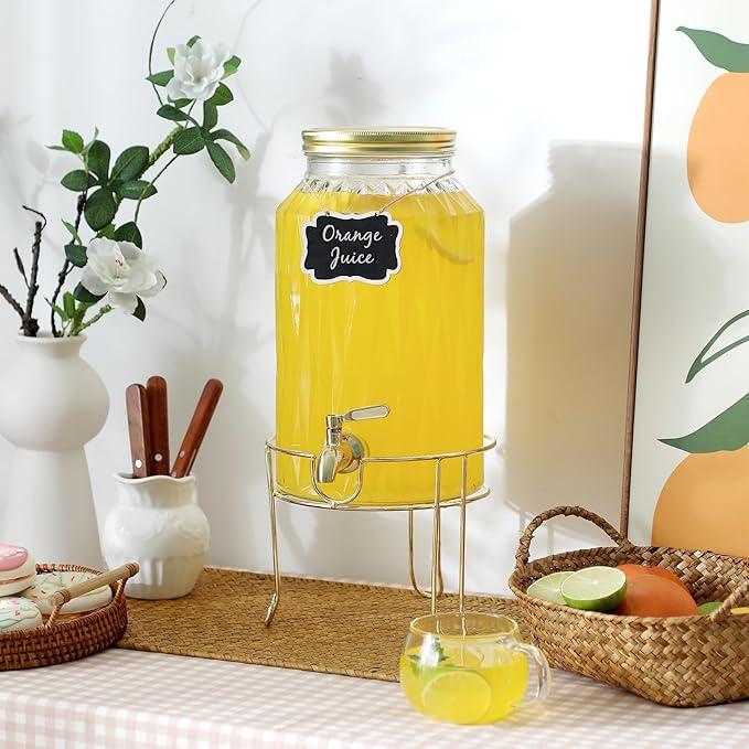 - Complete Beverage Dispenser Set with Accessories:Our drink dispenser set comes with everything you need for effortless serving — a thick glass container, a sturdy iron stand, a stainless steel spigot, a matching lid, chalkboard tags, a black marker, and assembly tools. The raised metal stand makes pouring easier while adding a rustic yet modern touch to your drink station