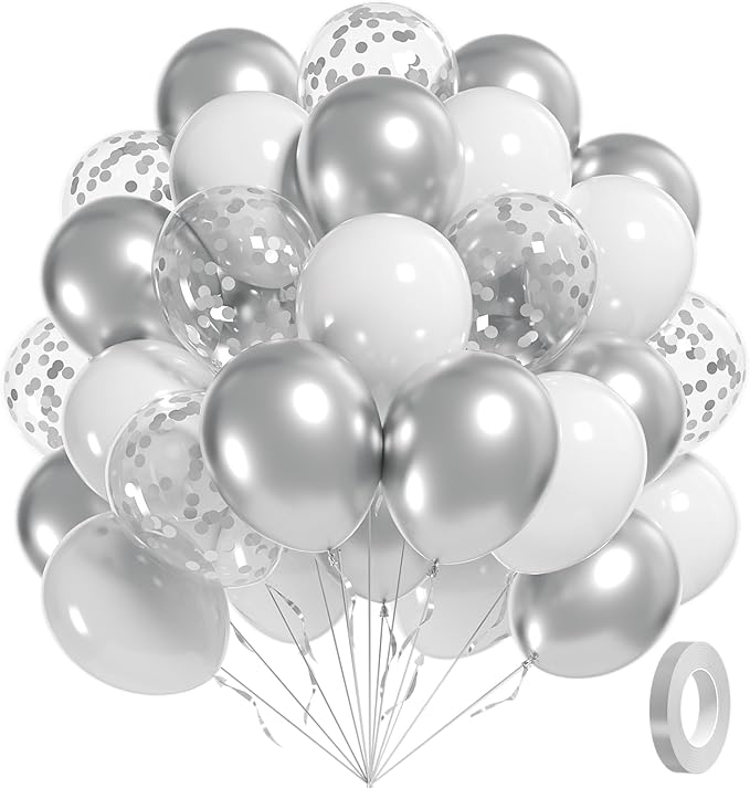 - Package Include: The white and silver balloons include 12inch white balloonsx25, 12inch metallic silver balloonsx25, 12inch silver confetti balloonsx10, glue dotsx20, silver ribbonx1
