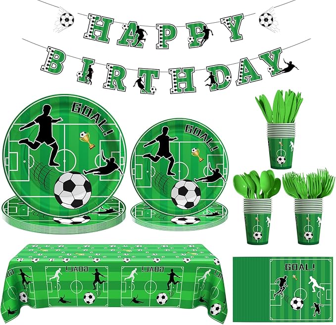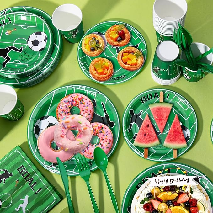 - 【Super Value Pack】Our 24 serves soccer party supplies set includes 24 pcs 9" paper plates, 24 pcs 7" paper plates, 24 pcs 9 oz paper cups, 24 pcs 6.5" x 6.5" napkins, 24 pcs plastic forks, 24 pcs plastic knives, 24 pcs plastic spoons, 1 pcs happy birthday banner, 1 pcs 54*108" tablecloths, total 170 pcs, with cool soccer designs
