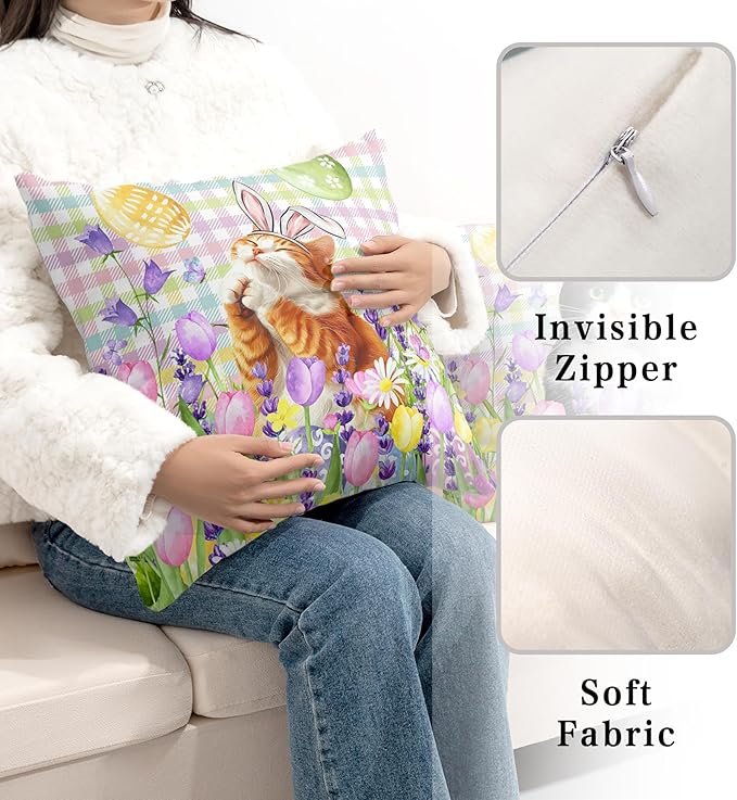 - NOVEL DESIGN: Our Easter lovely cat wearing bunny ears with colorful eggs and floral pillow cover can help you to change Easter decorations quickly. This Easter cat throw pillow cover will refresh your room, is easy to mix and match with other Spring Easter kitten floral decorative pillows or holiday decorations.