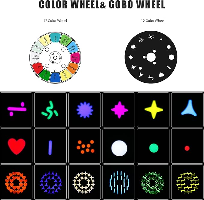 - 【Dynamic 12 Colors & 12 Gobos for Stunning Effects】Unleash a spectrum of creativity with 12 vibrant colors and 12 precise gobo patterns. Cycle through them to create everything from soothing ambience to intense strobe effects and mesmerizing patterns. Quickly transform any space - from a wedding hall to a nightclub dance floor - into a visual spectacle that elevates the music and energizes the crowd.