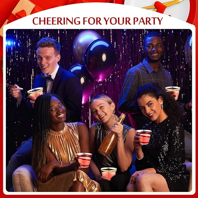 Gejoy 9 oz Rimmed Swirl Plastic Cups Disposable Wine Drinking Cups Clear Elegant Halloween Tumblers for Christmas Party Supplies(Red, Gold,100 Pcs)