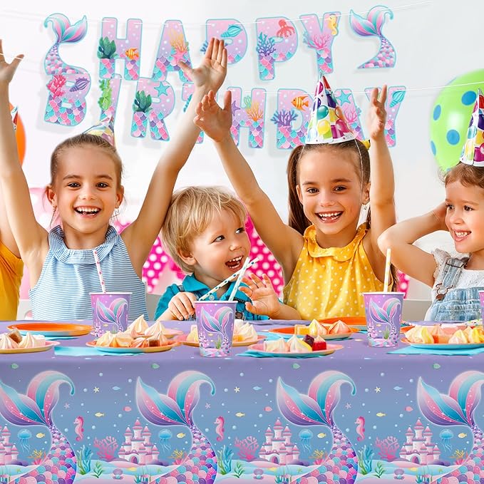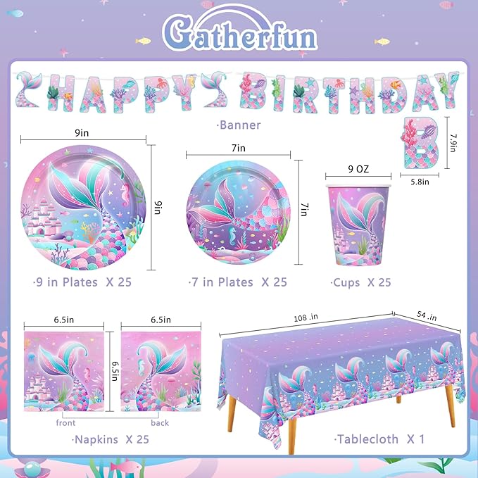 Mermaid Birthday Decorations for 25 Guests - Mermaid party supplies Kit Includes Dinner & Dessert Plates, Cups, Napkins, Banner & Tablecloth for 1st Birthday Party Decorations
