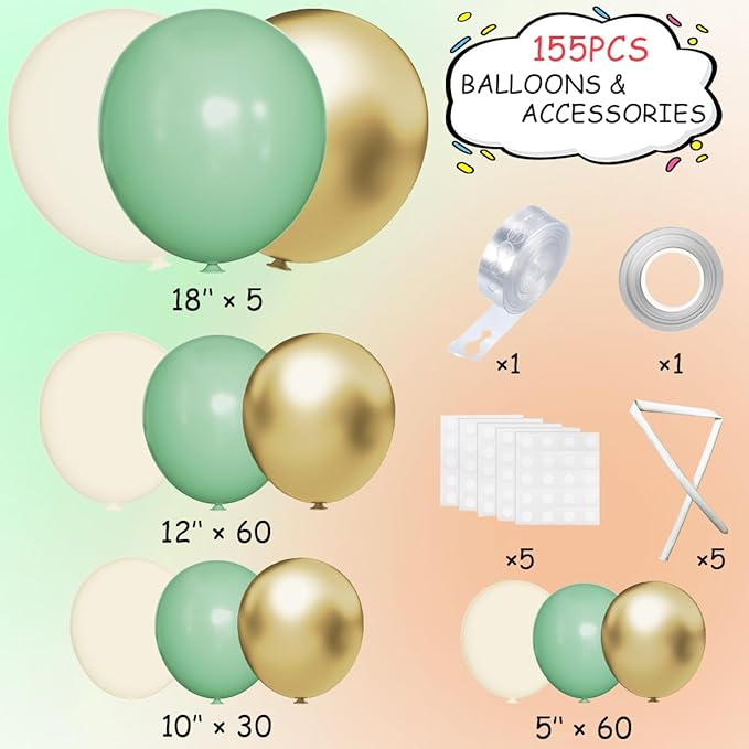 - Green Balloon Arch Kit: Pea Green Matte White Chrome Metallic Gold Latex Balloons in Various Sizes (18" 5pcs, 12" 60pcs, 10" 30pcs, 5" 60pcs), Decorating Strip (1 roll-16ft), Glue Dot (5 sheets-100pcs), Balloon Ribbon (1 roll-33ft), 260 White Balloons (5 pcs)