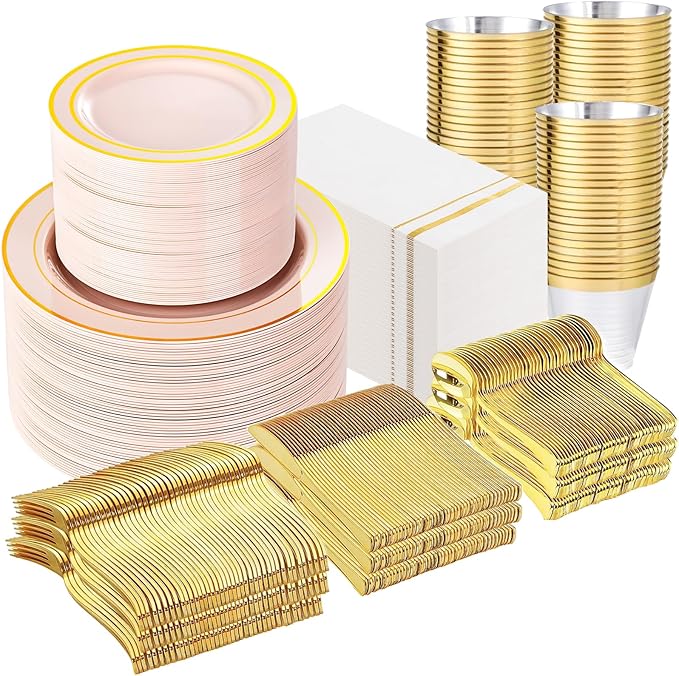 - Complete Value for Large Gatherings: The pink gold plastic dinnerware set includes everything needed for 100 guests. Mix and match pink party plates with gold silverware and cups to create a cohesive, celebratory atmosphere without overspending