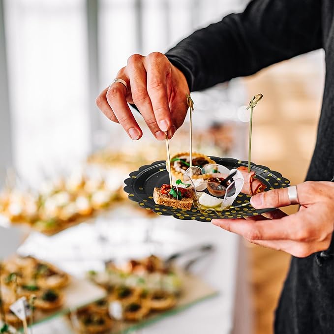 - 【EXQUISITE DESIGN】:Scalloped plates are decorated with gold polka dots, gorgeous and charming colors, these black and gold paper plates and napkins are very stylish and beautiful. Premium design adds a touch of elegance, making your party table instantly stand out.