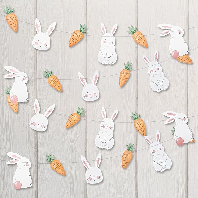 - Package: This set includes 2 garlands, each measuring 9.8 feet in length. Each garland features three unique adorable bunnies in white and pink, with orange carrots topped with green leaves stitched between them. Perfect for adding a touch of whimsy to any celebration!