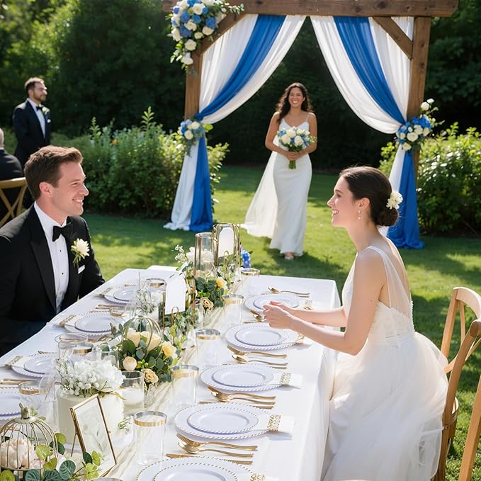 - [Hands go and enjoy the party]-White disposable plates with disposable plastic silverware,you can throw them away after you use them, giving you more time to invest in the fun time of the white with gold rim plates, and giving you more time to rest after the party.