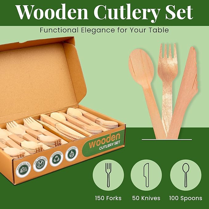 300 Pcs Disposable Wooden Cutlery Set (150 Forks, 50 Knives, 100 Spoons) – Eco Pack, Wooden Premium Cutlery Utensils for Sustainable Living, Perfect for Picnics & Everyday Use by Zestium