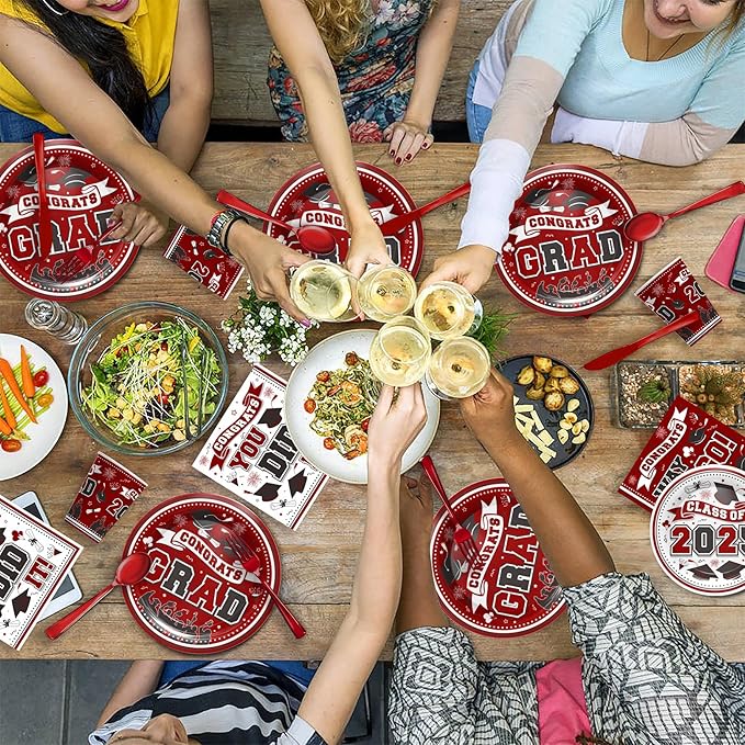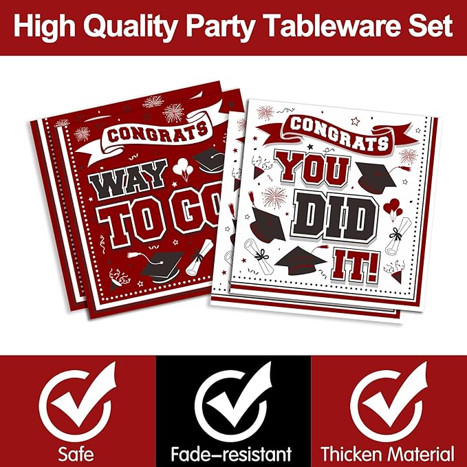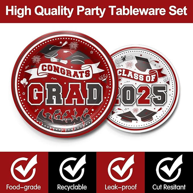 - 【Maroon Graduation Decorations 2025 Tableware】Do you want 2025 graduation party supplies? Do you want to hold a heavy ceremony for your graduation season ceremony? Our graduation season 2025 tableware set will leave a deep impression on your party. The theme of our set is maroon, and the elements on the plate further expressed this. Enjoy this pleasant big meal