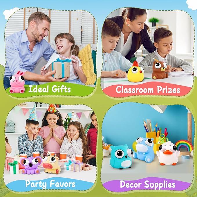 - 【Perfect Stress Relief Toys】When press the animal squeeze toys,these fidget toys will exaggerated pop-out eyes.These squishies toys can not only relieve irritability and anxiety in learning and work,but also help exercise hands and enhance awareness of animals and colors,there are more interesting gameplay options waiting for you to discover