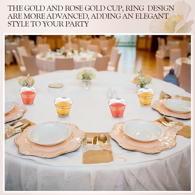 - Elegant and Exquisite Design: the elegant trim swirl around our 9 ounce clear plastic cups add a touch of elegance to your table in party or home and kitchen and leave your guest a good impression with these exquisite plastic cups