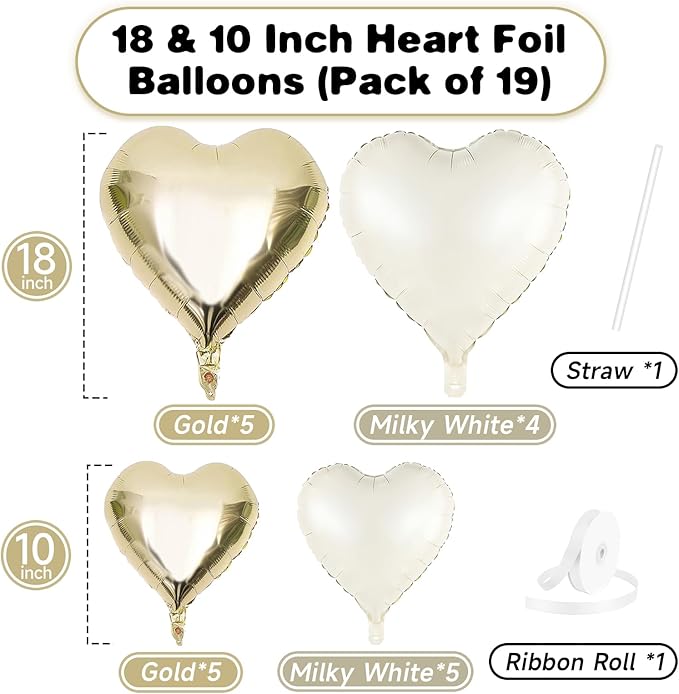 - Charming Champagne Gold Cream Heart Balloons: Elevate your celebration with our set of 19 heart-shaped champagne gold and white balloons, include 18in heart balloons (light gold x 5, white x 4), 10in heart balloons (light gold x 5, white x 5). Accompanied by a ribbon and straw, these balloons are ideal for creating a festive and loving atmosphere at any special event.