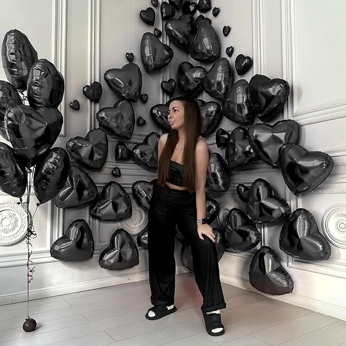 - Charming Black Heart Balloons: Elevate your celebration with our set of 19 heart-shaped black balloons, include 9 x 18in and 10 x 10in black heart foil balloons. Accompanied by a ribbon and straw, these balloons are ideal for creating a festive and loving atmosphere at any special event.