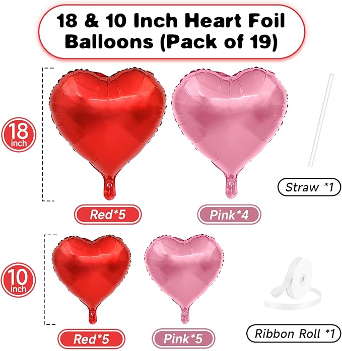 - Charming Pink Red Heart Balloons: Elevate your celebration with our set of 19 heart-shaped red pink balloons, include 18in heart balloons (red x 4, pink x 5), 10in heart balloons (red x 5, pink x 5). Accompanied by a ribbon and straw, these balloons are ideal for creating a festive and loving atmosphere at any special event.