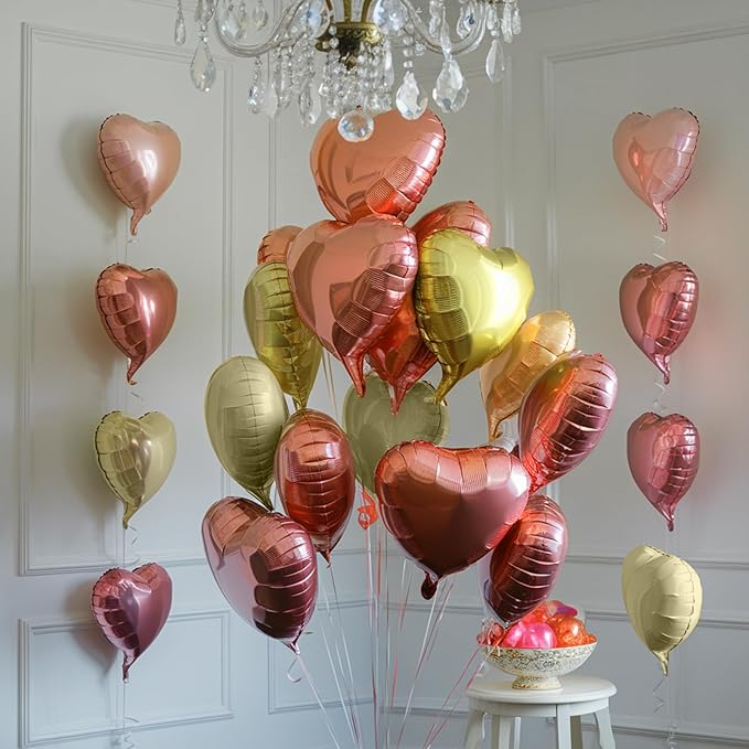 - Charming Champagne Gold Rose Gold Cream Heart Balloons: Elevate your celebration with our set of 19 heart-shaped rose gold and cream balloons, include 18in heart balloons (champagne gold x 3, cream white x 3, rose gold x 3), 10in heart balloons (champagne gold x 3, cream white x 3, rose gold x 4). Accompanied by a ribbon and straw, these balloons are ideal for creating a festive and loving atmosphere at any special event.