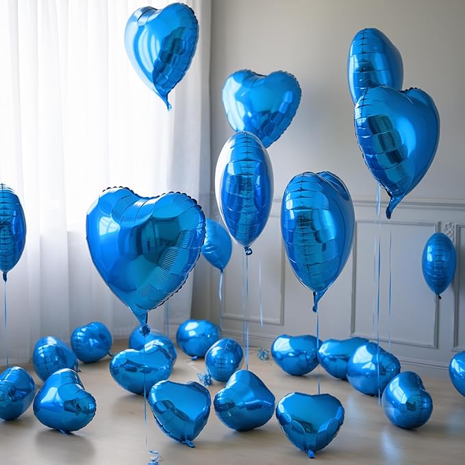 - Charming Blue Heart Balloons: Elevate your celebration with our set of 19 heart-shaped blue balloons, include 9 x 18in and 10 x 10in blue heart foil balloons. Accompanied by a ribbon and straw, these balloons are ideal for creating a festive and loving atmosphere at any special event.
