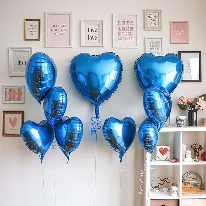 - Exceptional Craftsmanship: Elevate your decorations with our stunning 18-inch and 10-inch blue aluminum foil heart balloons. Crafted from top-notch aluminum foil, they feature a brilliant metallic finish that adds a touch of sophistication to any event. Sturdy and meticulously designed, these balloons retain their shape and vibrancy, commanding attention throughout your celebration.
