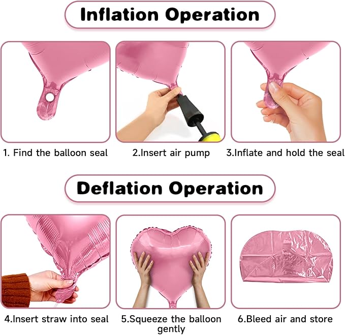 - Hassle-Free Setup: hassle-free decoration with our heart balloons that can be inflated effortlessly with either air or helium (optimal inflation is 85%-90% to prevent over-inflation). The convenient self-sealing valve locks in the air, ensuring long-lasting inflation. Plus, you can deflate them using a straw for future use, making them a versatile option for repeat celebrations.