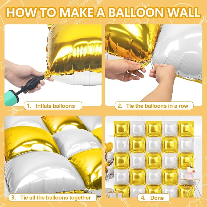 - Reusable and Recyclable: These gold foil balloons and pearl white foil balloons can be used to decorate indoor walls, floors and ceilings, as well as outdoor doorways. When the perfect party is over, separate the square balloons, then deflate them by inserting a straw into the inflator to recover and reuse them for your next event while also helping to reduce waste
