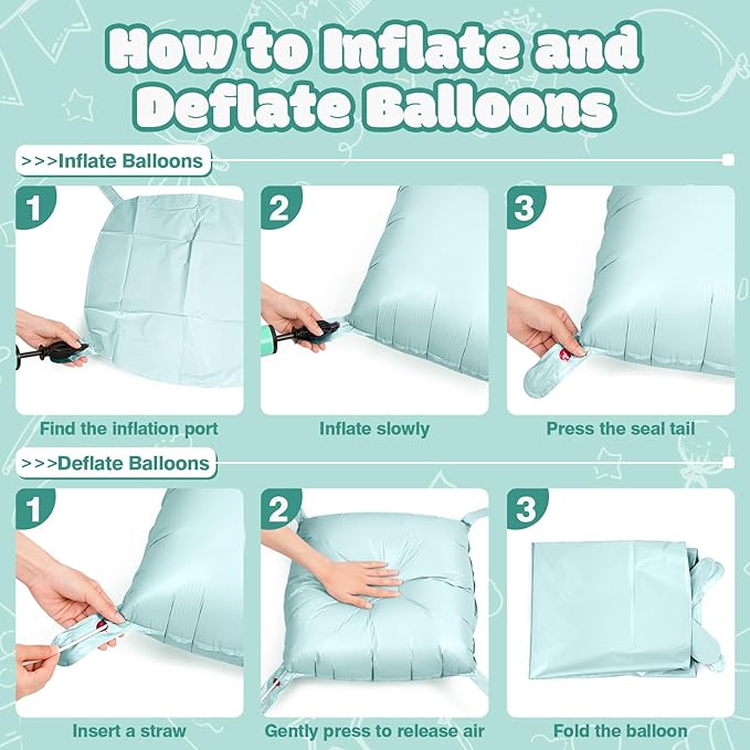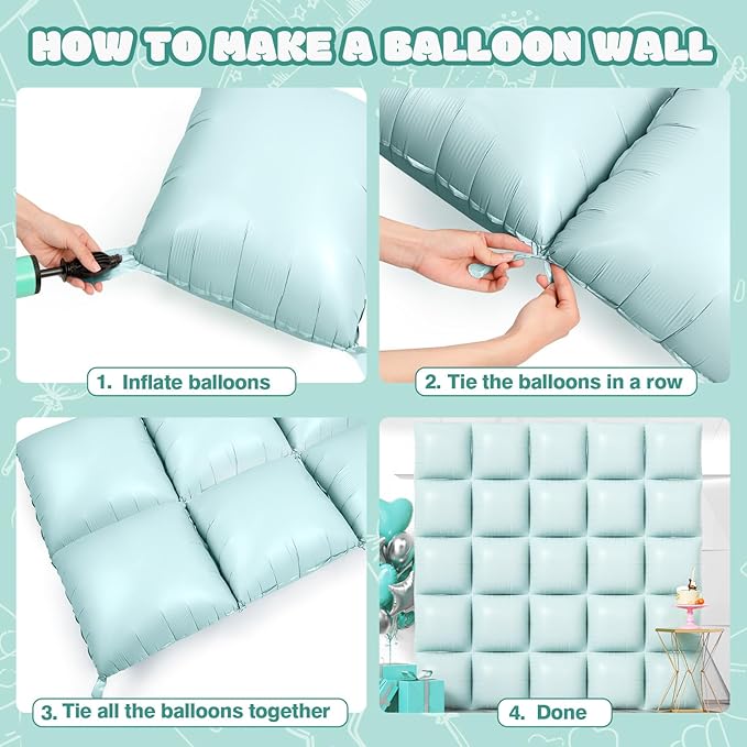 - Reusable and Recyclable: These double side pastel green foil square balloons wall decorations can be used to decorate indoor walls, floors and ceilings, as well as outdoor doorways. When the perfect party is over, separate the square balloons, then deflate them by inserting a straw into the inflator to recover and reuse them for your next event while also helping to reduce waste