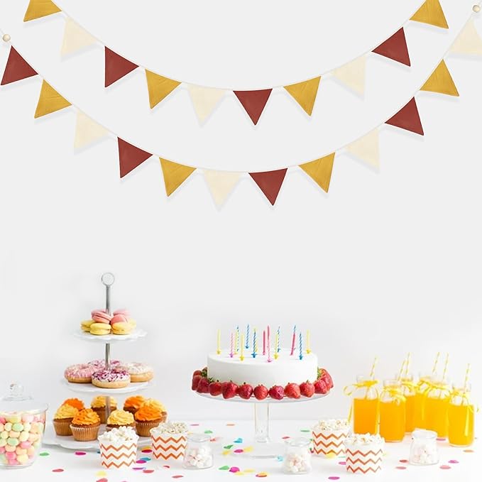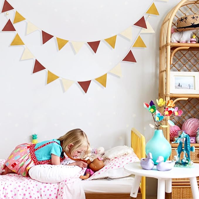 - Package Including:2 pack double layer linen fabric banner garland in brick red, yellow and beige colors, 12pcs flags in 8.2ft/2.5meters each, total is 5M/16.4Feet. Flag side length: 6.3in.Each string has two small wooden beads strung at the end.