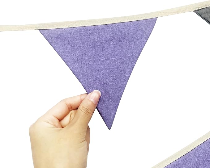 - Package Including:2 pack double layer linen fabric banner garland in purple, light purple and grey colors, 12pcs flags in 8.2ft/2.5meters each, total is 5M/16.4Feet. Flag side length: 6.3in.Each string has two small wooden beads strung at the end.