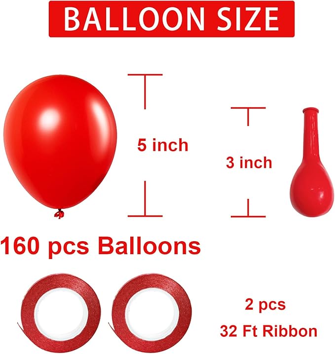 - 【Party-Ready Kit】Score 160pcs 5-inch red party balloons + 2 pcs 33ft ribbon—perfect for arches, photo backdrops, or slinging across the dance floor.Spot-on quantity for nailing that “wow” factor at weddings, Halloween party decorations, or fiestas.