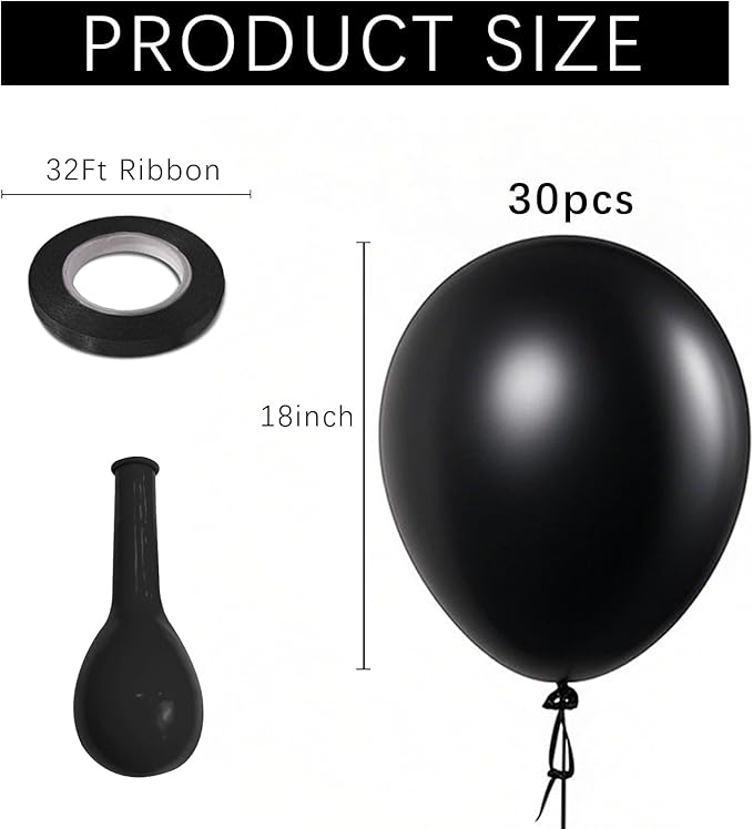 - Everything You Need in One Pack:Get 30pcs black 18-inch balloons plus two 33-foot black ribbon.Plenty to decorate ceilings, doorways, or create a photo-worthy balloon arch.Pair them with black happy birthday balloons or black baloons for themed vibes.