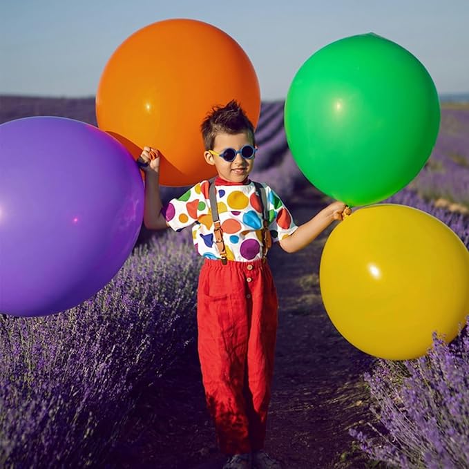 - 10 Pcs Balloon Assortment & Ribbon:Each set includes 10 assorted 36-inch latex balloons (red, yellow, royal blue, light blue, lime green, light green, pink, purple, dark purple, orange) and two 33-foot white ribbon. The variety of balloons assorted colors ensures flexibility for rainbow-themed arches, baby shower decorations, or birthday balloon bundles.