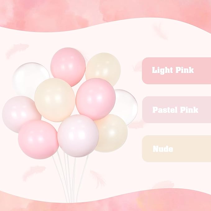 - Package Include: The balloon kit includes 12inch pink balloonsx20, 12inch pastel pink balloonsx15, 12inch nude balloonsx15, 12inch clear balloonsx10, glue dotsx20, pink ribbonx1