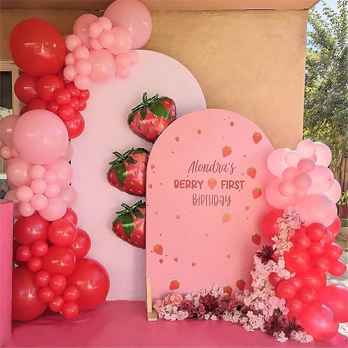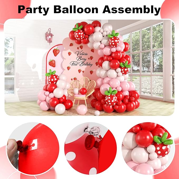 - Easy to Assemble:The detachable design of the strawberry birthday party decorations makes assembly easy and flexible, allowing you to try different balloon garland shapes and styles, and adapt the berry balloons to different room sizes and layouts. You can arrange the red pink white balloons according to the space and theme needs, the assembly process is not only quick and easy, but also inspires your creativity.